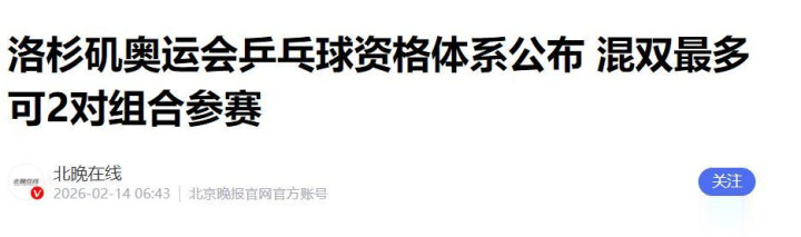 北晚在线——洛杉矶奥运会乒乓球资格体系公布 混双最多可2对组合参赛